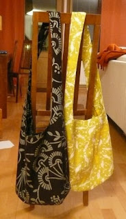 Tiiq on tosi hyvä ompelija, niinpä meidän vaihdantakaupoissa vein hänelle kankaita helmimerkkien ja jämälankojen mukana ja sain jo pari valmista kassia takaisin, kolmas on vielä tulossa. Upeita kasseja, tummempi on ollut jo käytössä ja on saanut huomiotakin töissä.